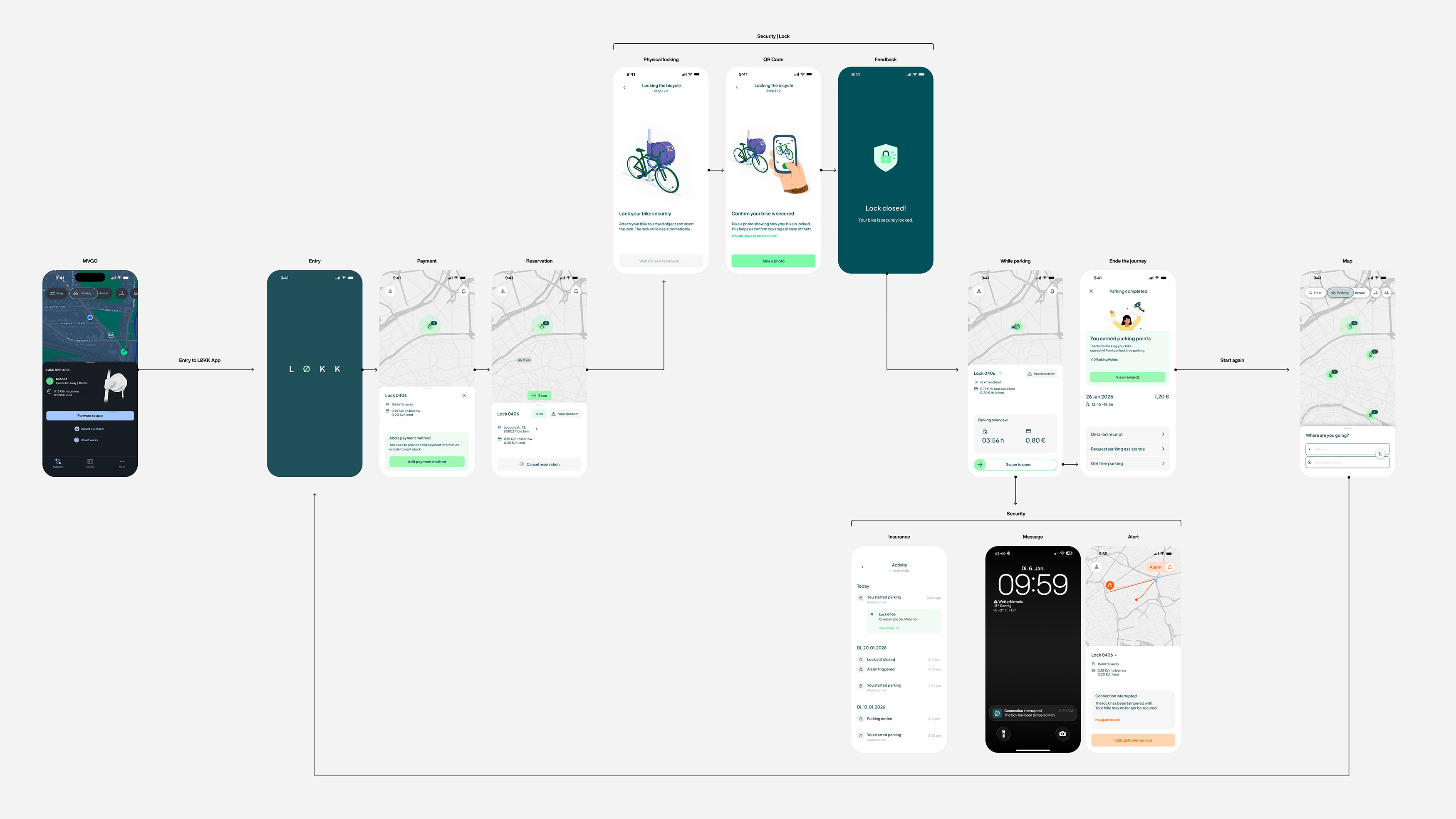The following journey illustrates how users are guided through the process from finding a station to securely locking and unlocking their bike.