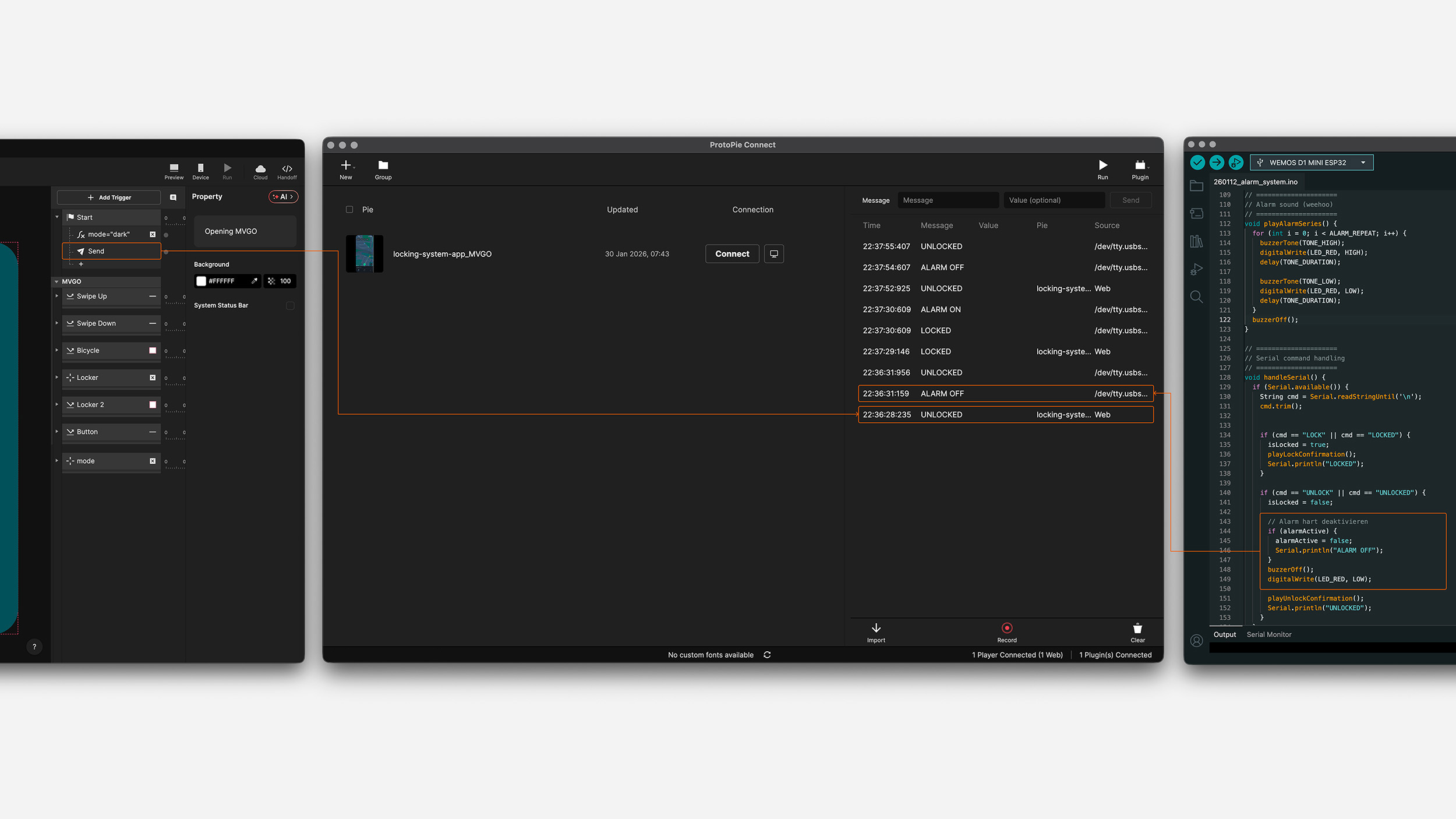 Using ProtoPie and Arduino, we simulated real-time communication between app and hardware, allowing us to test feedback, system states, the alarm logic and interaction logic.