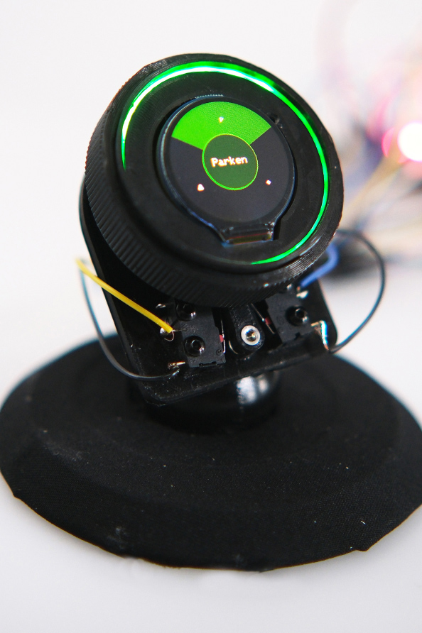 The smart parking terminal presents itself as a minimal, display-based interface that visualizes the surroundings and highlights parking availability through color-coded feedback.